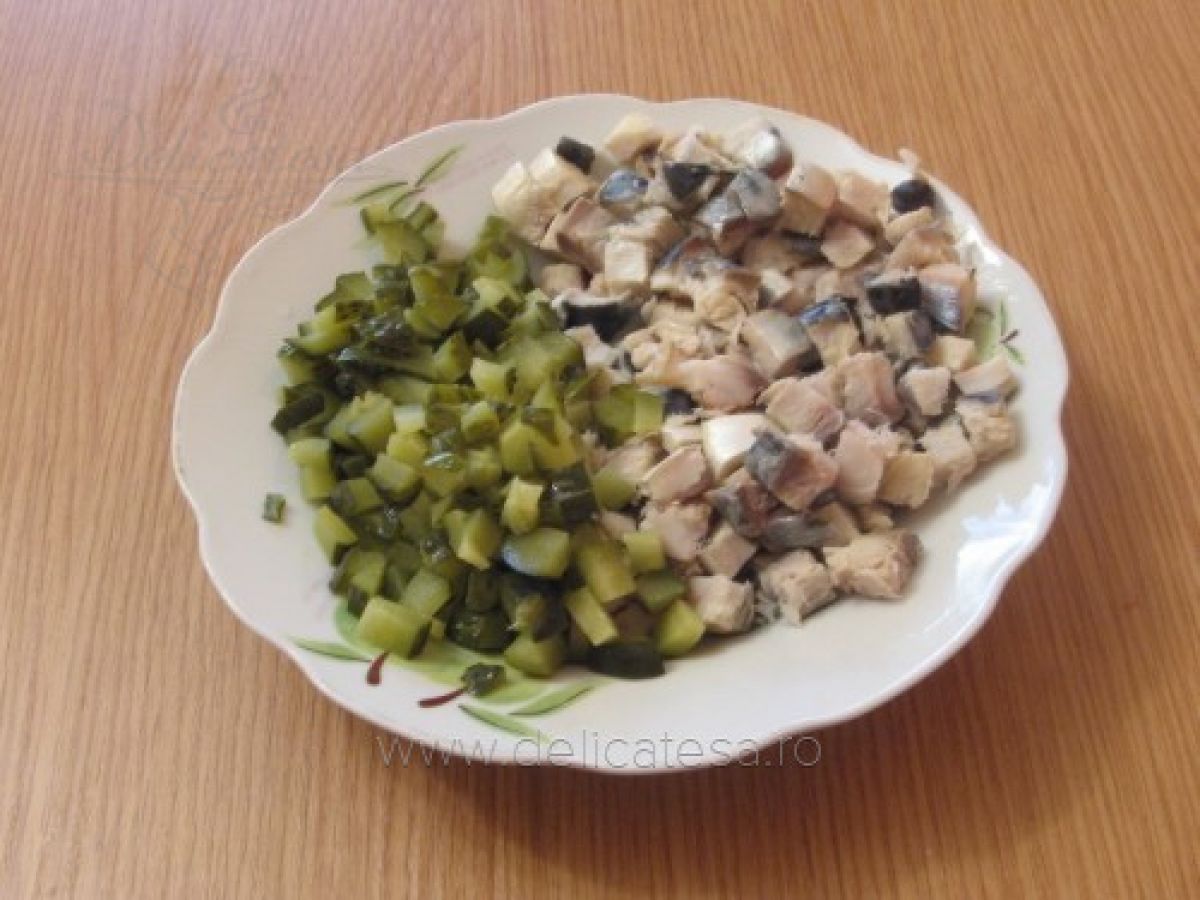 Sfecla si cartofii curatati se dau pe razatoarea mare, pestele se dezoseaza si se taie bucatele potrivite, ceapa se taie solzisori. Se amestecă cu maioneza şi se mai potriveşte se sare (dacă mai este cazul). Peştele marinat şi castraveţii se taie în cubuleţe mici.
